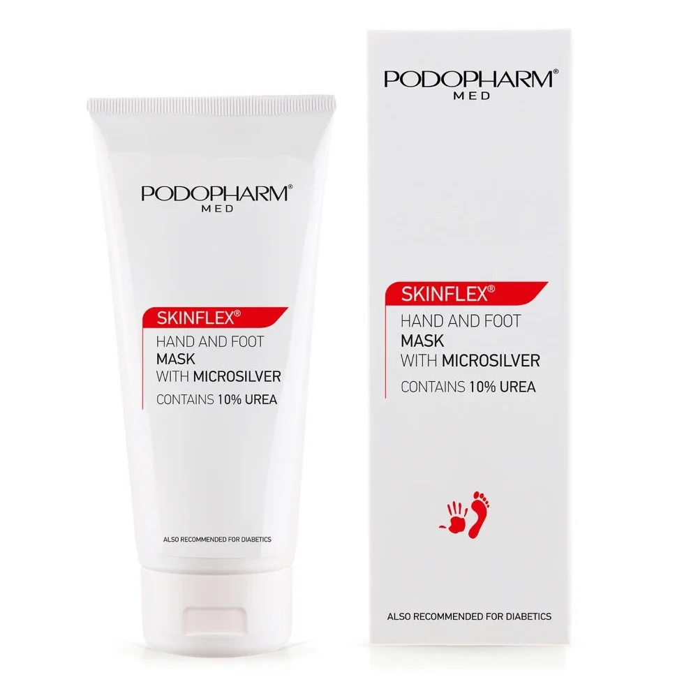 Maska do dłoni i stóp z mikrosrebrem SKINFLEX łączy 10% mocznika z kompleksem Hydroviton PLUS, aby skutecznie wiązać wodę w naskórku, zmiękczać szorstkie partie i przywracać elastyczność. Mikrosrebro z pantenolem pomaga łagodzić podrażnienia, a masło shea, olej konopny oraz witamina E odżywiają skórę i poprawiają jej wygląd. To maska do bardzo suchej skóry dłoni i stóp, którą można stosować w ciągu dnia jako krem oraz maskę na noc.